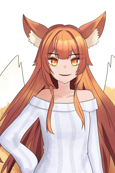 There, sprawled on his couch, was a fox girl. Long auburn hair cascaded down her back, twitching fox ears poked through her messy locks, and six thick, bushy tails flicked idly as she flipped through TV channels.